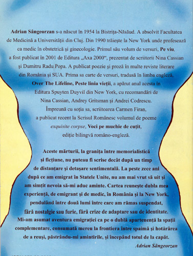 Volumul este un excelent jurnal al experienţelor (nu numai) medicale prin care a trecut Adrian Sângeorzan ca medic ginecolog atât în România, cât şi-n Statele Unite - unde a emigrat după 1990, la o vârstă la care şansele de a profesa acolo erau minime. A reuşit datorită unei tenacităţi ieşite din comun, iar acum este perfect integrat şi apreciat ca medic într-un mare spital din New York.